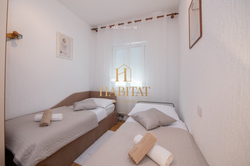 Stan se nalazi na prvom katu obiteljske kuće. Čine ga tri spavaće sobe i tri kupaonice s tuš kabinama, velika kuhinja, ostava te dva balkona i veranda. Jedan balkon nalazi se na izlazu iz dnevnog boravka s veličanstvenim pogledom na more, drugi se nalazi na južnoj strani kuhinje, dok sjeverni izlaz iz kuhinje vodi na natkrivenu verandu. Stan je opremljen klima uređajima u dnevnom boravku i spavaćoj sobi. Parking u vlasništvu.