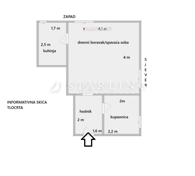 Stan se sastoji od dnevnog boravka/spavaće sobe, kuhinje, kupaonice s wc-om i hodnika.