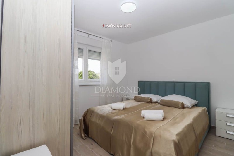 Ovaj stan smjestio se na prvom katu zgrade. Sastoji se od otvorenog prostora koji dijele kuhinja sa dnevnim boravkom i blagovaonicom i izlazom na terasu. U nastavku se nalaze dvije spavaće sobe te kupaonica. Na okućnici se nalazi pripadajuće parking mjesto. Stan je opremljen podnim grijanjem i klima uređajem. Ukupna neto površina stana iznosi 64,17m2. Dokumentacija uredna.