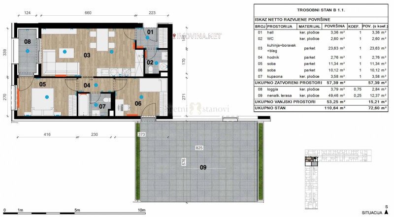 Stan se sastoji od ulaznog hodnika, dnevnog boravka s kuhinjom i blagovaonom, 2 spavaće sobe, kupaone, dodatnog WC-a, loggie i prekrasne terase.
