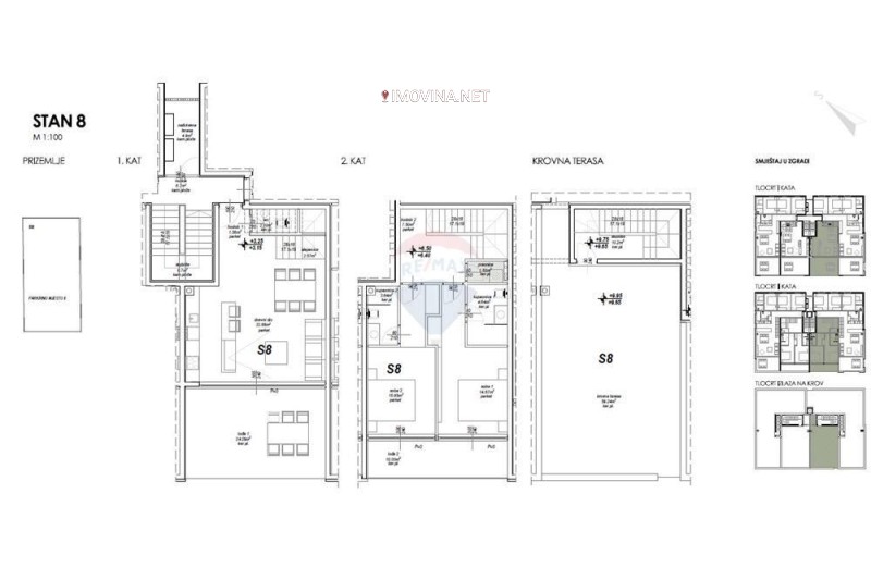 Površina pripadajućeg dijela krovne terase za stan (S8) iznosi 14.81 m2.