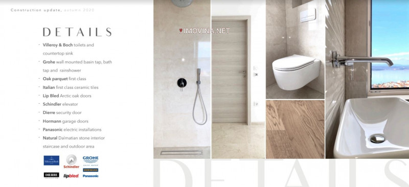 Samo najkvalitetnija oprema ugrađena je u stan. Podovi u dnevnoj sobi i u spavaćim sobama su od prvoklasnog hrastovog višeslojnog parketa. Keramika u kupaonicama i hodnicima je prvoklasna talijanska keramika velikog formata, ponegdje sa reljefnom obradom. Kupaonska slavina i tuš ruža, slušalica i baterija su GROHE linija Essence, sa podžbuknom montažom. Umivaonik je Villeroy-Boch, WC školjka je Villeroy-Boch slim line, bez ruba sa direct flush ispiranjem i slim sporospuštajućom daskom. Vodokotlići su također Villeroy-Boch. Kupaonice su opremljene električnim podnim grijanjem. Vanjska stolarja je drvo-aluminij, velikih formata. Dvije spavaće sobe opremljene su polu francuskim otvorima dimenzija 180 x 170 cm i pružaju nevjerojatan pogled čak i dok ležite u krevetu. Dnevni boravak ima staklenu sijenu dimenzija 320 x 240 cm. Sva električna instalacije je Panasonic, a u svim sobama izvedena je instalacija interneta i SAT TV. Svaka soba je klimatizirana. Unutarnja sobna vrata su dodatno zvučno izolirana. Ulazna sigurnosna vrata su Dierre, poznati talijanski proizvođač. Na krovu se nalazi krovna terasa, gdje je instalirana voda, odvodnja i struja i može se ugraditi Jacuzzi, ljetna kuhinja ili BBQ. Krovna terasa nije za zajedničko korištenje već se kupuje odvojeno i nije u cijeni stana. Okoliš zgrada bogato je uređen autohtonim biljnim vrstama.