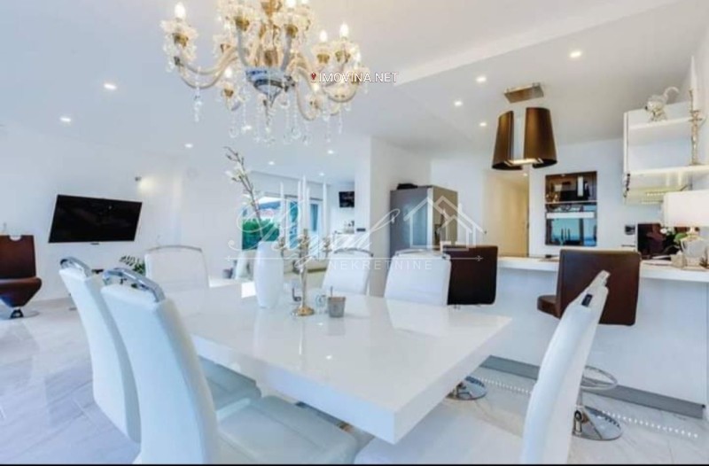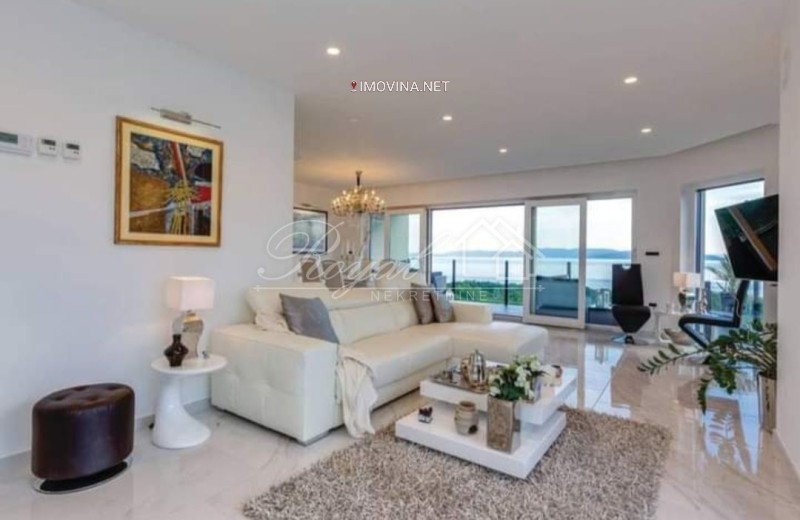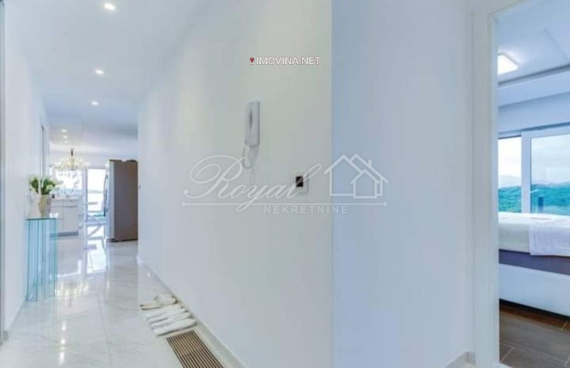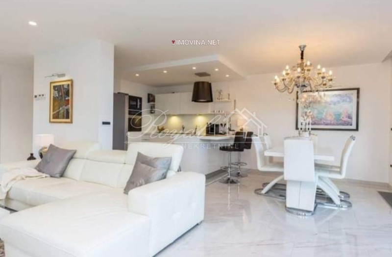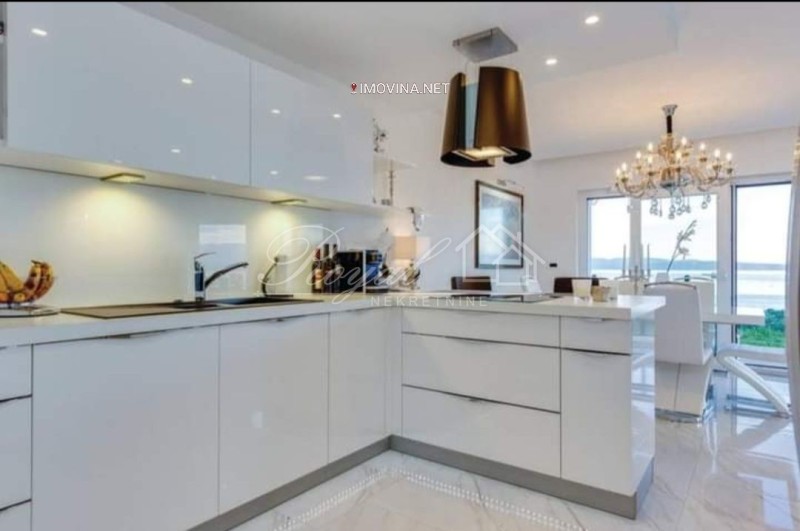 Smješten na 2.katu moderne, urbane vile u mirnom dijelu naselja, svojim uređenjem se definitivno ističe u ponudi. U 122 m2 stambenog prostora raspoređen je dvosoban stan s dnevnim boravkom i dvije kupaone. Velikim staklenim stijenama osigurano je obilje dnevne svjetlosti u stanu, a ona je ujedno i jedino što dijeli cijeli dnevni dio od velike lođe s koje se pruža prekrasan pogled na more. Dvije spavaće sobe od kojih je jedna "master bedroom" s vlastitom kupaonom i lođom. U stanu je još jedna kupaona, mali wc za goste i vešeraj.