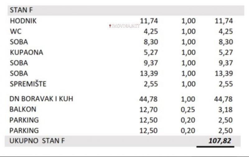 Stan od 108 kvadrata pruža prostran i udoban životni prostor s tri spavaće sobe. Stanu pripadaju dva parkirna mjesta, što je vrlo praktično i olakšava parkiranje automobila. Stan je osvijetljen velikim prozorima koji pružaju obilje prirodnog svjetla u dnevnom boravku i spavaćim sobama. Kuhinja i dnevni boravak su otvorenog tipa, što stvara prostran i ugodan prostor za druženje i zabavu. Svaka spavaća soba je dovoljno prostrana za ugodan odmor i opuštanje, a kupaonica je moderna i opremljena vrhunskom sanitarnom opremom. Stan je idealan za veće obitelji ili parove koji žele imati više prostora za život, te istovremeno žele imati svoja parkirna mjesta na raspolaganju. Svojim prostranim i modernim rasporedom, ovaj stan pruža udobnost i funkcionalnost svakodnevnog života.