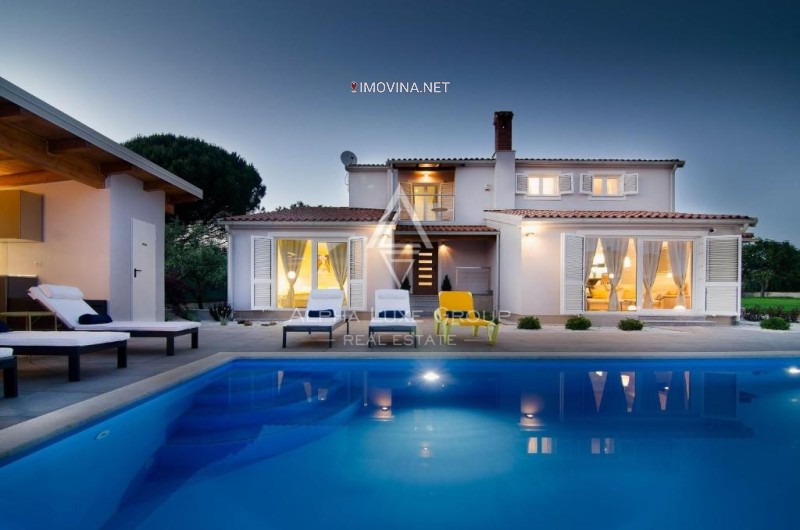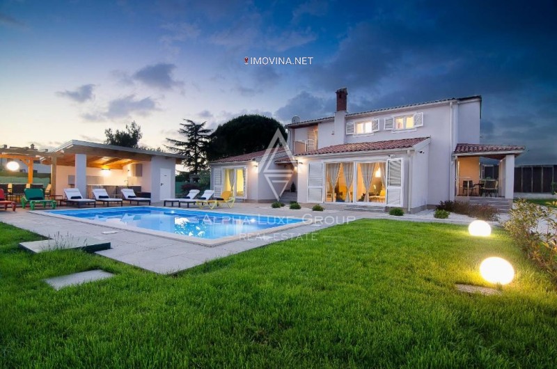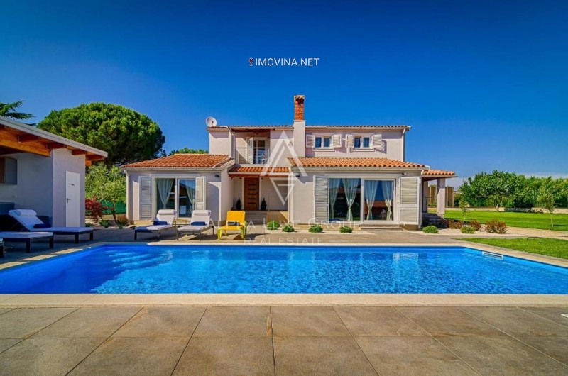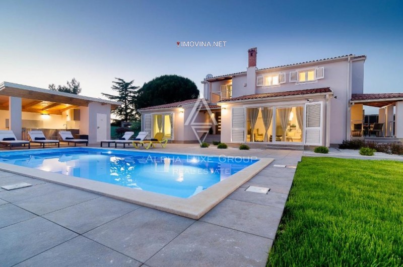 Posebna prednost ove nekretnine je uređena okućnica površine 1.366 m² koja pruža privatnost i potpunu udobnost. U dvorištu se nalazi grijani bazen dimenzija 9 x 4 m, natkrivena ljetna kuhinja, dječji park te zelene površine s automatskim navodnjavanjem. Na stražnjem dijelu parcele osigurano je parkiranje za 4 automobila.