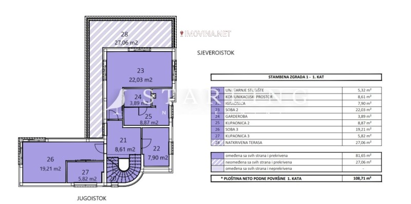PRVI KAT: dvije sobe s vlastitim kupaonicama odnosno garderobom, igraonica, unutarnje stubište te vanjska natkrivena terasa.