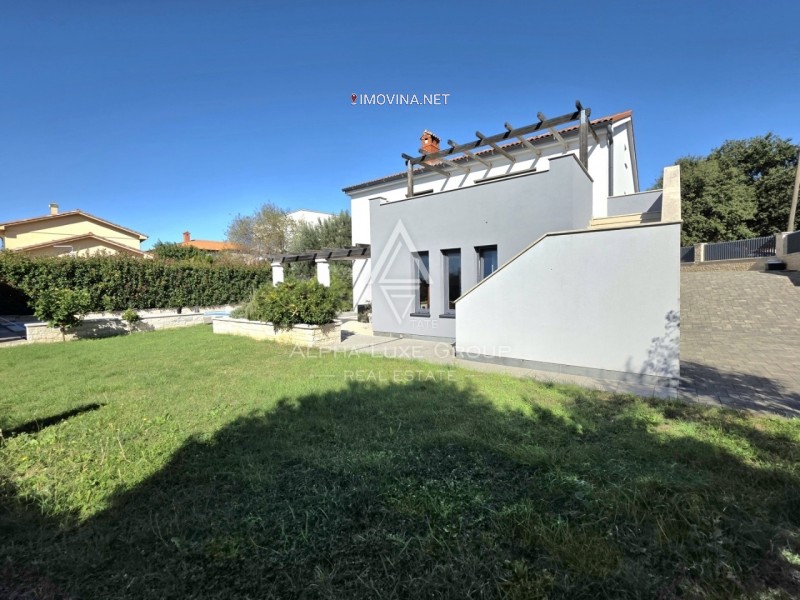Nekretnina se nalazi na potpuno uređenoj parceli od 900 m², ograđenoj zidom koji osigurava privatnost. Prednji dio dvorišta nudi dva natkrivena parkirna mjesta i dodatna otvorena mjesta za šest do sedam vozila. Stražnji dio dvorišta predstavlja pravu oazu s grijanim bazenom, sunčalištem, prostranom ljetnom kuhinjom s roštiljem i travnatom površinom idealnom za druženja, djecu i kućne ljubimce. Mediteransko bilje, masline, cvjetne gredice i automatsko navodnjavanje upotpunjuju vanjski ambijent.