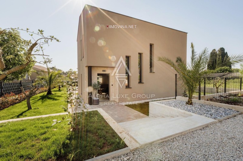 Vanjski prostor je pažljivo uređen s mediteranskim biljem, bazenom i privatnim parkirnim mjestima. Kvalitetna PVC stolarija u antracit boji opremljena je komarnicima i električnim roletama, dok dodatne pogodnosti uključuju alarmni sustav i video nadzor. Grijanje i hlađenje regulirani su klima uređajima i sustavom dizalice topline.
