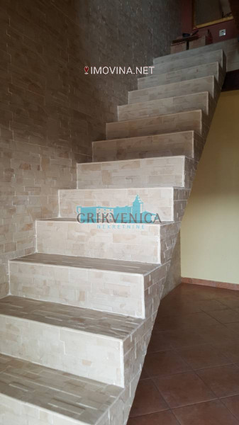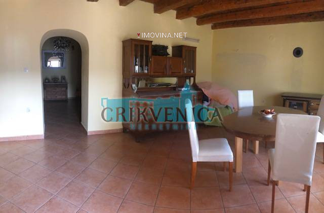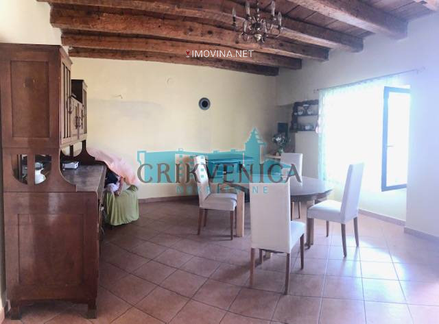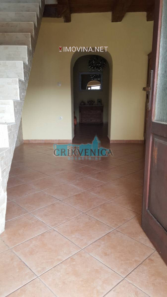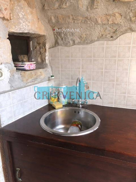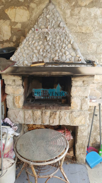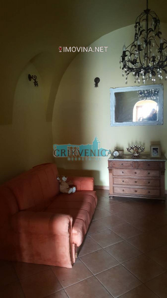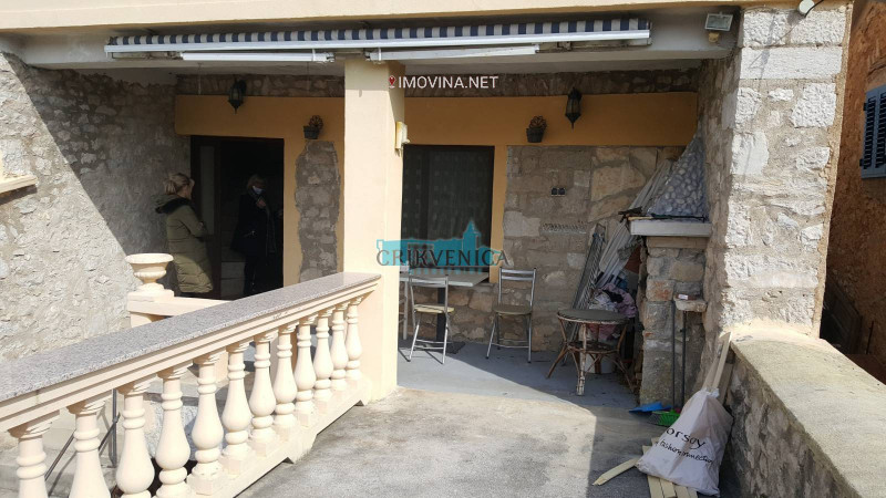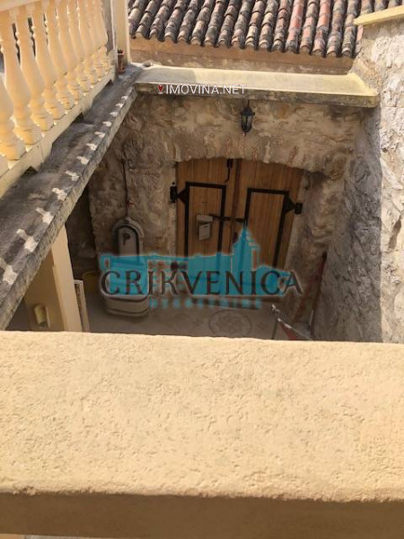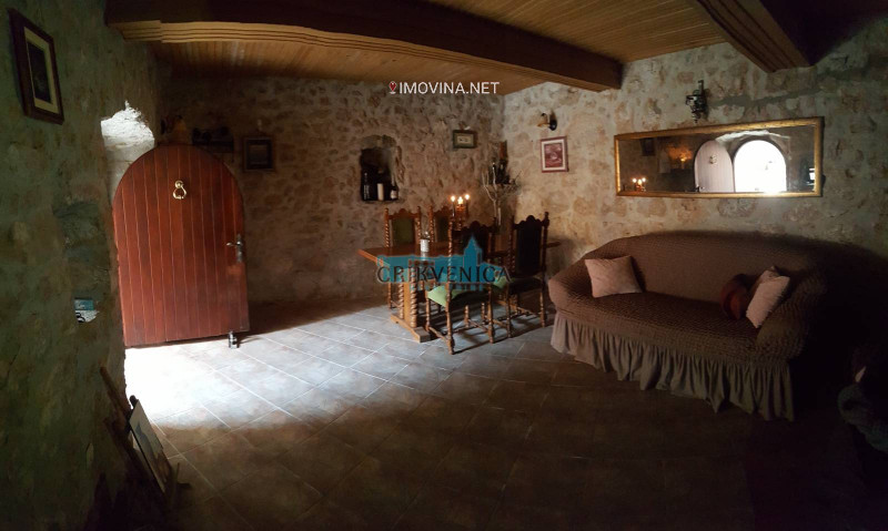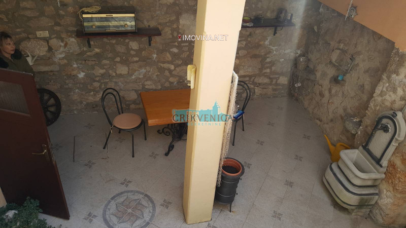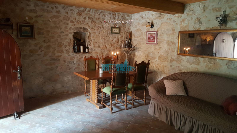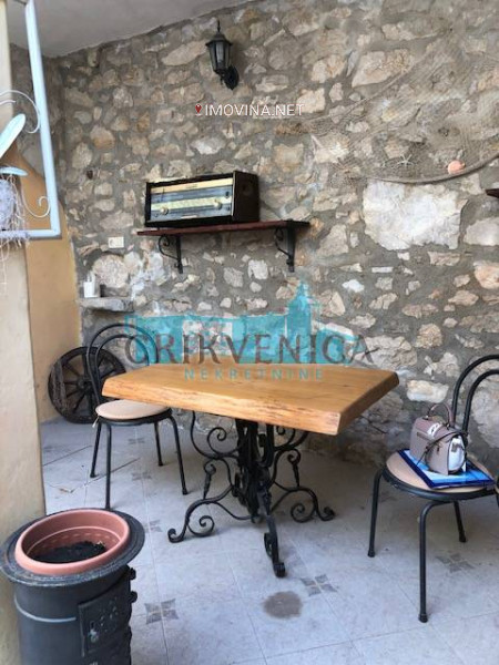 U prizemlju se nalazi konoba od 25m2, dvor, ljetna kuhinja i kupaonica. Dvor je opasan kamenim zidom. Ulaz u dvor krase prekrasna drvena vrata. Kuća je puna lijepih detalja i namještena starinskim kvalitetnim namještajem.