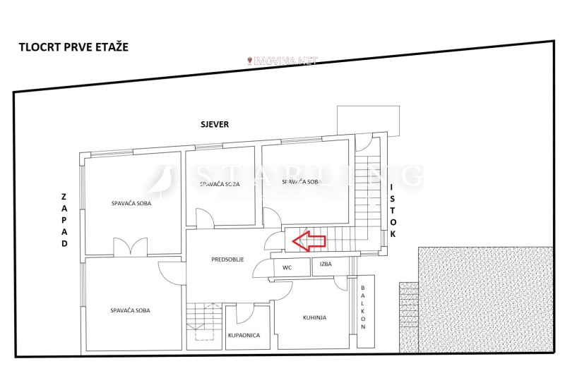 PRVE ETAŽE gdje se nalazi dnevni boravak, kuhinja s blagovaonicom, tri spavaće sobe, kupaonica, WC, izba, predsoblje te balkon.