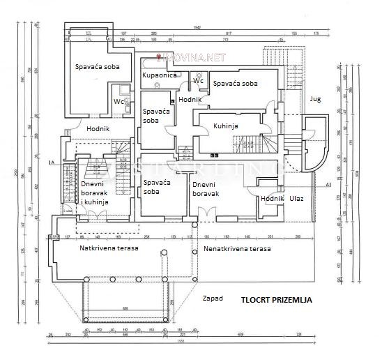 Prizemlja, površine 221 m2: dnevnog boravka, kuhinje, blagovaonice, 5 spavaćih soba, 2 kupaonice, wc-a, hodnika, 1 natkrivene terase i jedne nenatkrivene terase.