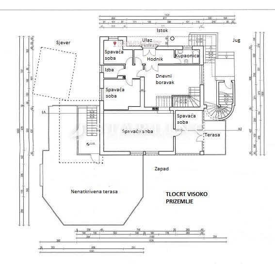 Visokog prizemlja, površine 155 m2: dnevnog boravka, 4 spavaće sobe, kupaonice, spremišta i 2 nenatkrivene terase.