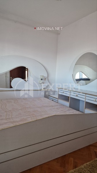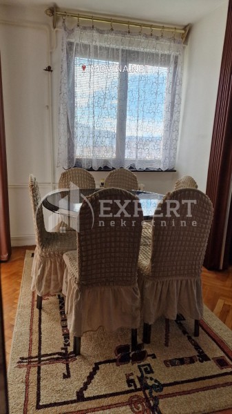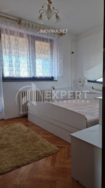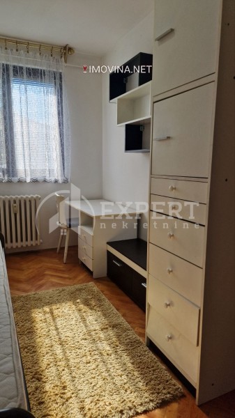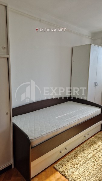 Izdaje se stan površine 74m2 na petom spratu u zgradi bez lifta. Sastoji se od ulaznog hodnika, trpezarije sa kuhinjom, dnevne sobe, dve spavaće sobe, kupatila, toaleta i terase. Grejanje je centralno. Komplet je opremljen nameštajem i svom potrebnom belom tehnikom. Lepo je osvetljen i orijentisan. Izdaje se ozbiljnim zakupcima na duži vremenski period. Obavezan depozit u visini jedne mesečne kirije.