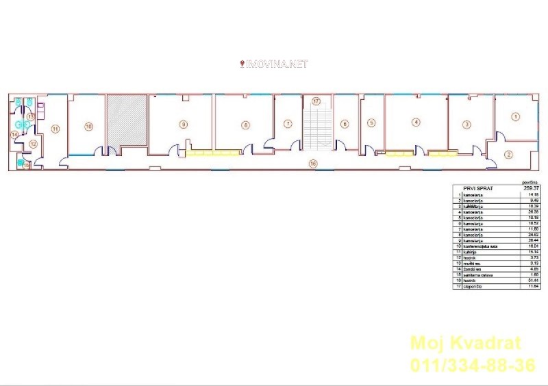 Izdaje se kancelarijsko-poslovni prostor na veoma atraktivnoj lokaciji u okviru poslovnog centra. Poseduje 10 odvojenih kancelarija različitih površina, kuhinju, dva hodnika, sanitarnu ostavu, dva toaleta (muški i ženski) i stepenište koje samo zakupac koristi.