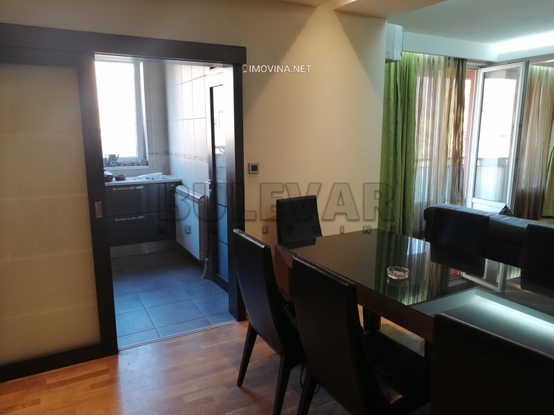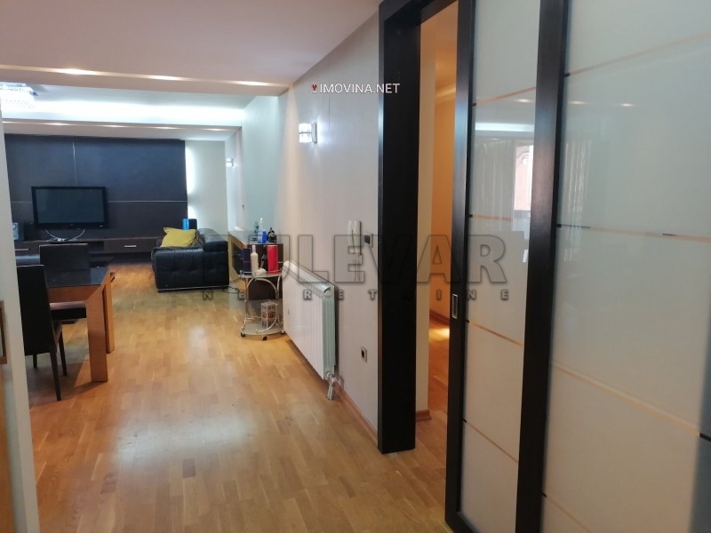 Izdaje se luksuzno namešten stan u zgradi u blizini ambulante Rasadnik, na drugom spratu u zgradi bez lifta. Površina stana je 150m2, a struktura je čevorosoban. Stan se sastoji iz ulaznog hodnika, dnevne sobe sa trpezarijom i kuhinjom, tri spavaće sobe, kupatila i dve terase. Grejanje u stanu je centralno ali je trenutno stan isključen sa mreže /moguć priključak ponovo/.Opremljen je novim luksuznim nameštajem i belom tehnikom /djakuzi,kožne garniture../. Veoma lepo je osvetljen i orijentisan. Ima svoje parking mesto.Ima klimu.Pogodan je za poslovne ljude. U blizini zgrade se nalazi sve što je neophodno za normalan život.