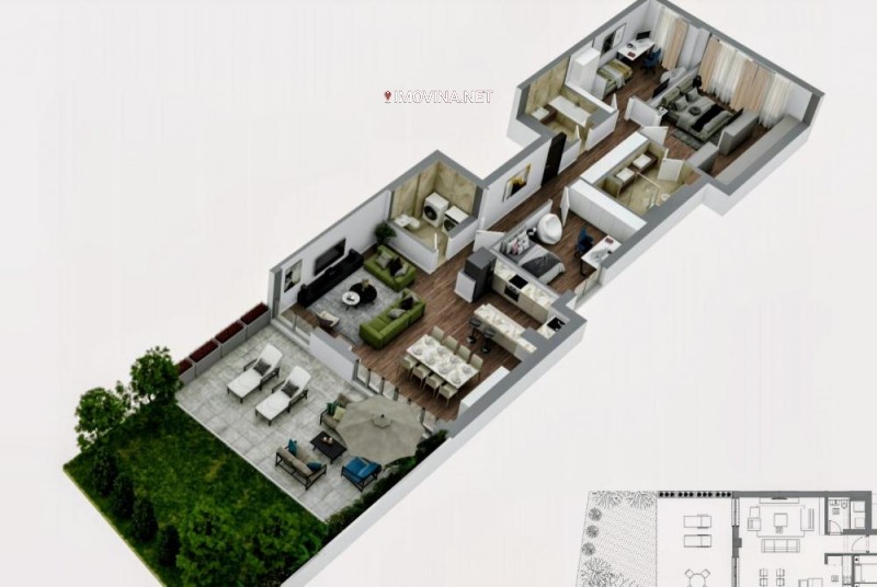 Raspored je izuzetno funkcionalan – stan se sastoji od prostrane dnevne sobe sa izlazom u prelepu baštu, dok je spavaći blok odvojen hodnikom i obuhvata tri spavaće sobe, od kojih je jedna master soba sa sopstvenim kupatilom i walk-in garderoberom. Posebna prednost je što kuhinja i master kupatilo imaju prirodnu ventilaciju.