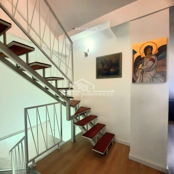 U donjem delu stana je jedinstveni prostor sa prelepim pogledom, koji se sastoji od dnevnog boravka, trpezarije, kuhinje, kupatila, garderobera i dve spavaće sobe.