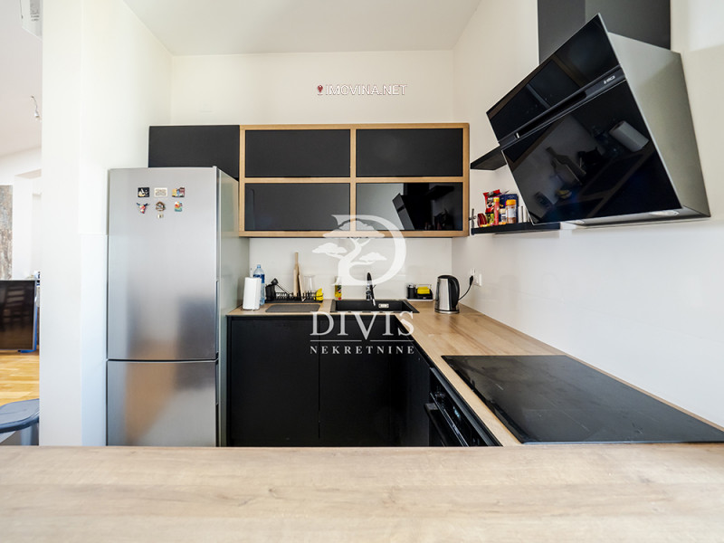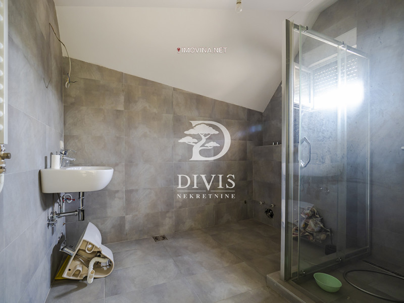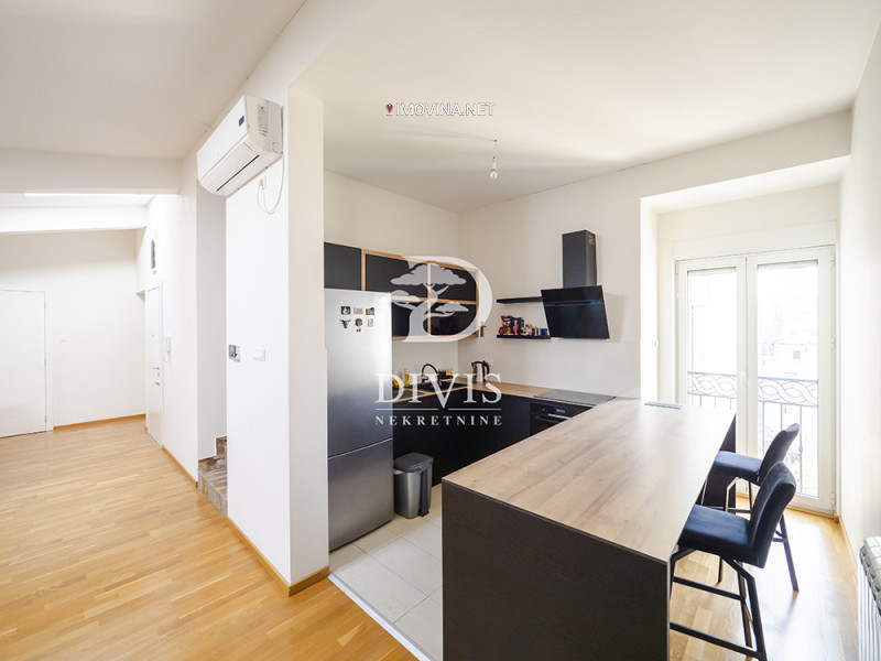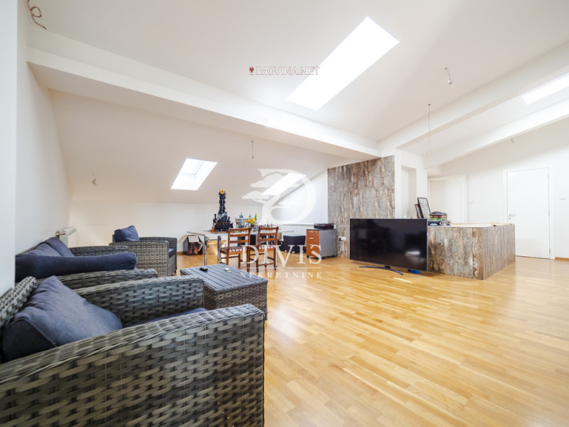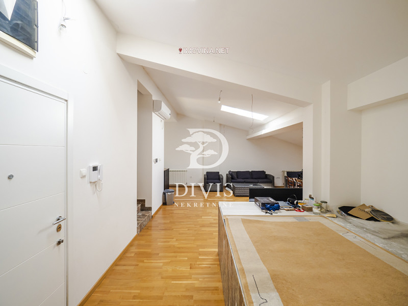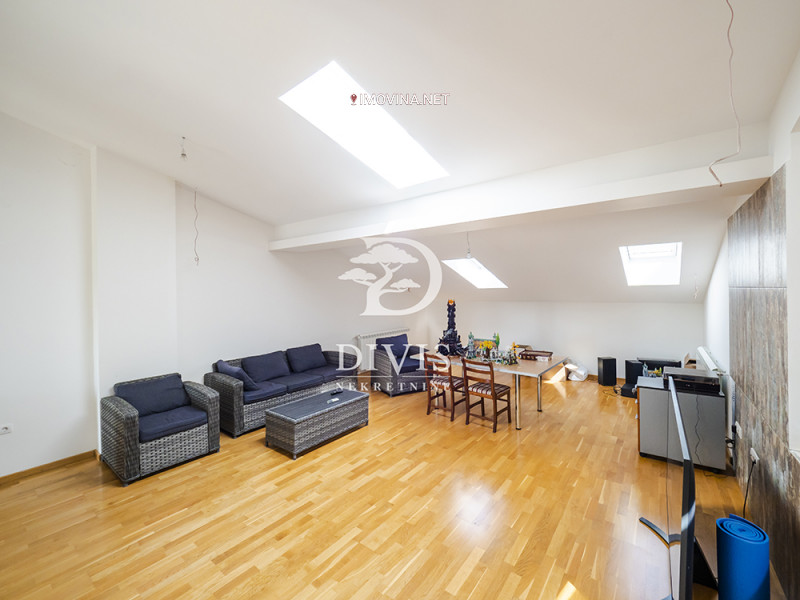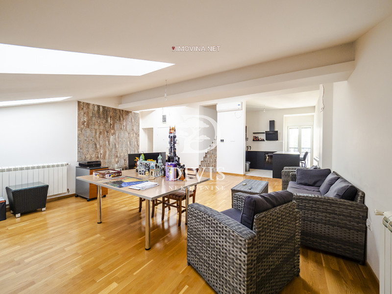 Stan se sastoji od velike dnevne sobe, trpezarije i kuhinje (open space) tri spavaće sobe, kupatila i toaleta na donjem nivou, dok nas svega par stepenika vodi do drugog nivoa koji izlazi na terasu od 44m2 sa koje se pruža prelep pogled na grad, tu se još nalazi kupatilo i tehnička soba.