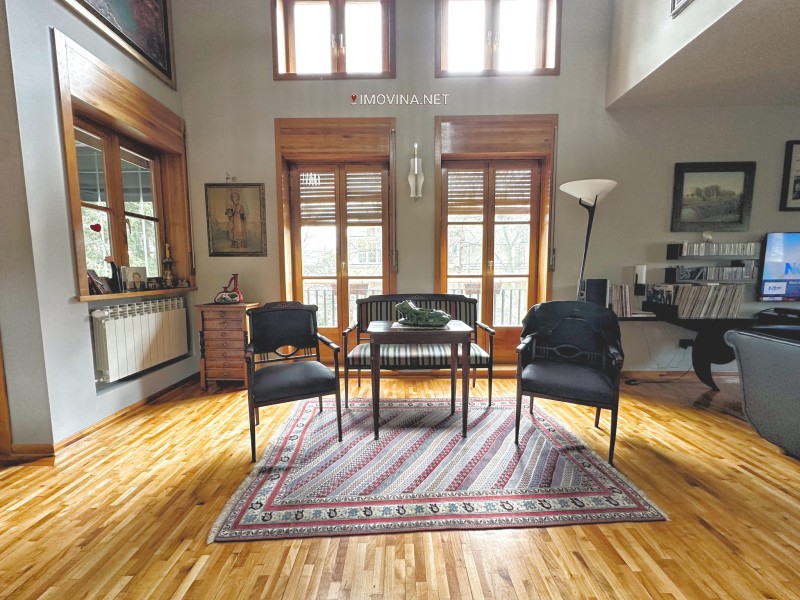 Na prestižnoj adresi – ulica Vladimira Gaćinovića, Dedinje, u neposrednoj blizini američke ambasade i drugih diplomatskih predstavništava, nalazi se ovaj prostrani stan od 198m² sa galerijom, smešten na drugom spratu u zgradi sa svega pet stanova.