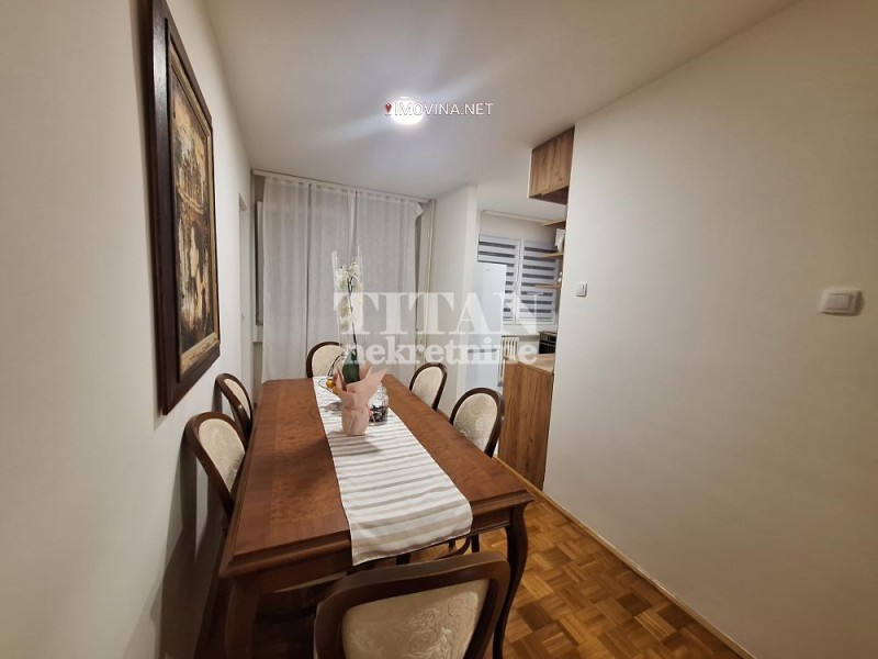 Od ulaza desno je jedna ogromna spavaća soba , preko puta je kupatilo koje je kompletno renovirano kao i cela vertikala tako da u budućnosti se ne očekuju problemi iz stana iznad. Levo je ulaz u trpezariju povezanu sa elegantnom i sa puno ukusa i kvalitetno urađenom kuhinjom, prostranom sa prozorom. Iz trpezarije postoji izlaz na terasu, kao i iz dnevne sobe koja je velika.