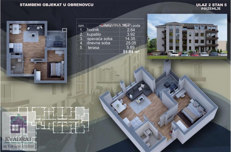 Dvosoban stan 51.84 m², PR, Obrenovac - 71.280€. Na prodaju dvosoban stan površine 51,84m² u prizemlju stambene zgrade u izgradnji. Stan se sastoji od ulaznog hodnika, dnevne sobe sa kuhinjom i trpezarijom, spavaće sobe, kupatila.