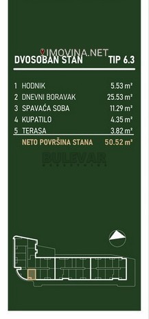 Struktura: ulazni hodnik dnevni boravak sa kuhinjom i trpezarijom spavaća soba kupatilo terasa Kvadrature i dostupnost: