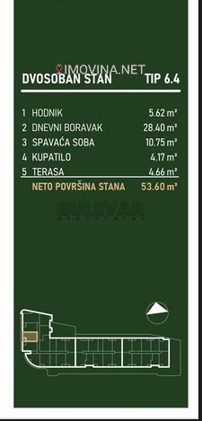 U ponudi je dvosoban stan u savremenom stambeno-poslovnom kompleksu koji čine tri lamele modernog arhitektonskog izraza: Lamela A – kula od 15 spratova sa 182 stana Lamela B – objekat od 10 spratova sa 72 stana Lamela C – objekat od 10 spratova sa 72 stana Kompleks je projektovan tako da budućim vlasnicima pruži moderan način života kroz spoj luksuza, funkcionalnosti i komfora, uz visok kvalitet gradnje i savremeni dizajn. Ukupno je planirano 326 stanova u 14 tipova sa različitim kvadraturama i varijantama.