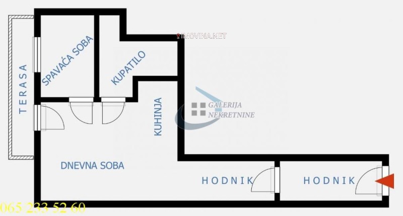 Od prostorija: hodnik, kuhinja, dnevni boravak, spavaća soba, kupatilo, terasa.