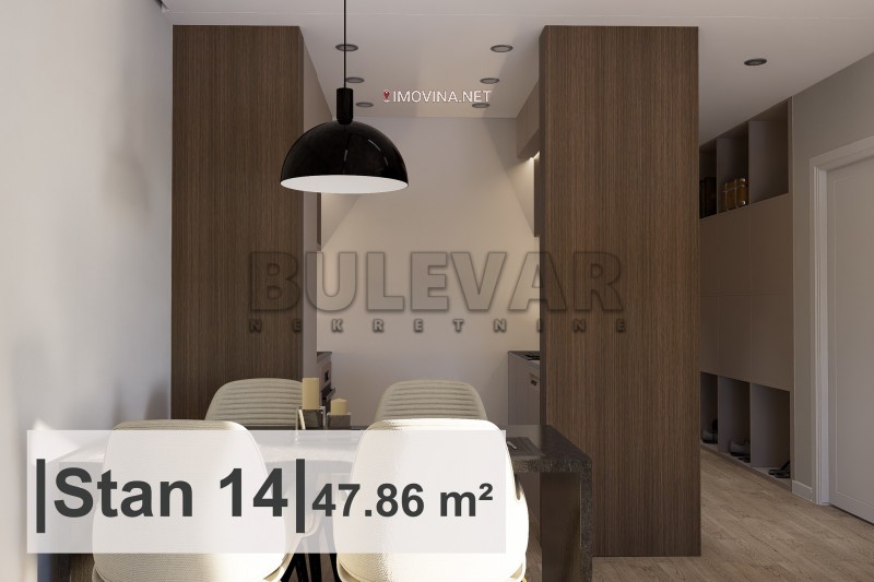 Na prodaju ekskluzivna novogradnja u centru. Stambeno poslovni objekat Po+P+8. Stan je projektovane površine 47,86m2. Nalazi se na trećem spratu, čine ga ulazni hodnik, dnevna soba sa trpezarijom i kuhinjom, spavaća soba, toalet, kupatilo i terasa. Svaka stambena jedinica ima nezavisan sistem grejanja i hlađenja koji je automatizovan i moguće ga je kontrolisati putem mobilnog uređaja. Sistem za grejanje je postavljen kroz pod sa elektro-kotlom, dok je rashladni sistem sa invertor klimama. Svi podovi izvedeni su kao plivajući sa ugrađenom zvučnom izolacijom. Na podu je višelojni parket, a u kupatilu granitna keramika. Unutrašnja stolarija izrađena je od visoko kvalitetnog furnira, dok je spoljna stolarija od aluminijuma. Predviđeni rok završetka je jun 2027. godine. Za kupce prvog stana postoji mogućnost povratka PDV-a. Postoji mogućnost kupovine parking mesta. Ovo je samo deo naše ponude, za više informacija stojimo Vam na raspolaganju.