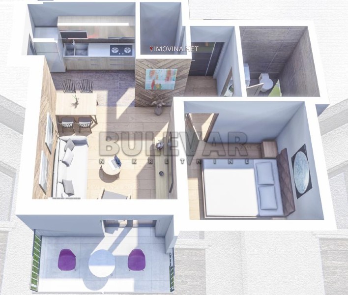 Stan je po strukturi jednoiposoban, površine 39.34 m2. Sastoji se od hodnika, dnevne sobe sa trpezarijom, izdvojene kuhinje, spavaće sobe, kupatila, terase i ostave.