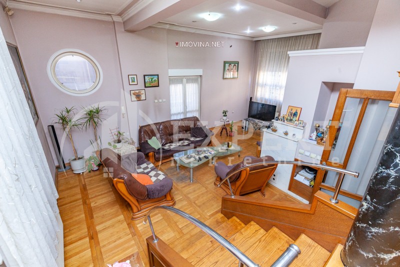 Prodaje se lux kuća po plus vpr plus jedan, u osnovi 150m2, ukupno oko 450 m2, na placu od 288 m2 u blizini Šojke. Kompletno je izgrađena od kalitenih materijala i opremljena nameštajem. Unutrašnje stepenište vodi na visoko prizemlje koje se satoji od prostranog dnevnog boravka sa izlazom na terasu. Par stepenika iz dnevne sobe vode u trpezarijski deo sa izlazom na terasu, a u produžetku je dvoredna kuhinja sa svim potrebnim elementima i tehnikom. Kuhinja ima izlaz u predsoblje kuće iz koga se ulazi u spavaću sobu sa francuskim lezajem i veliko kupatilo. Na spratu kuće se iz hodnika ulazi u sve prostorije, tri spavaće sobe i porodično kupatilo.Veća spavaća soba ima izlaz na dve terase i hodnik sa ugradnim plakarima koji vodi do drugog kupatila. Grejanje je etažno sa kotlom na stuju ili čvrsto gorivo. Sav nameštaj i enterijer je rađen kvalitetnim materijalima. Na podovima je prvoklasni parket i keramika. U suterenskom delu kuće je kotlarnica i garaža za dva vozila. Oko kuće postoji i deo dvorišta sa mogućnošću parkiranja jednog vozila. Zbog svoje lokacije, funkcionalnosti, blizine škole, vrtića, fakulteta, trgovina, idealna je za miran i komforan porodični život. Uknjižena vlasništvo 1 kroz 1.