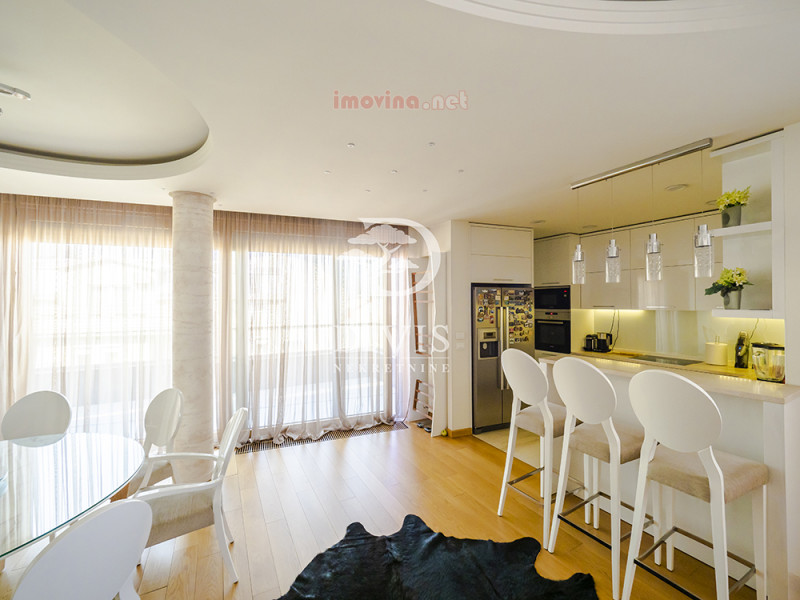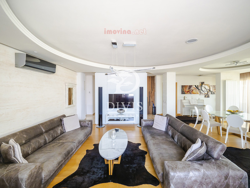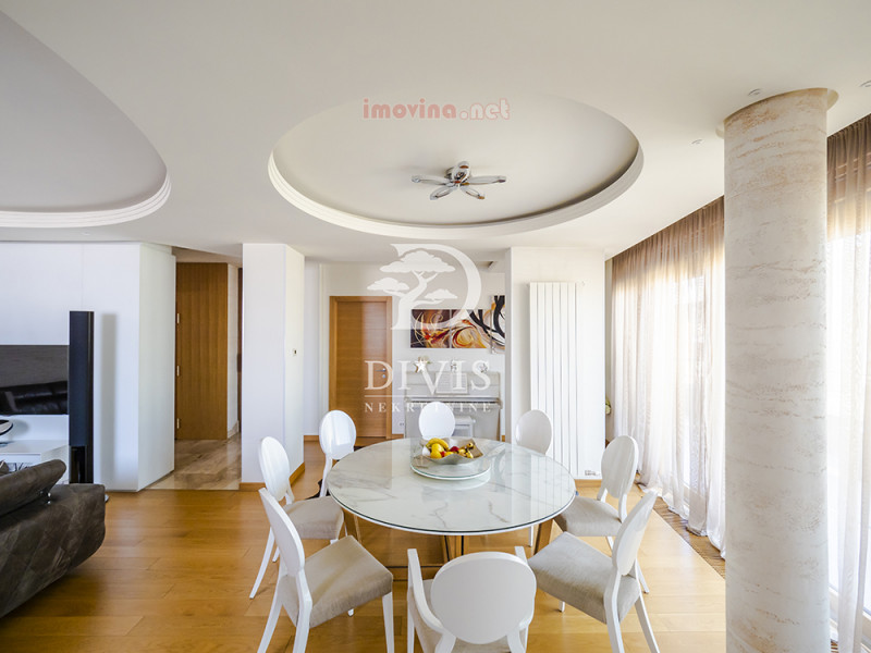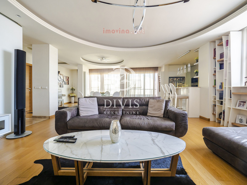 Na prvom nivou stana nalazi se prostrani dnevni boravak sa kuhinjom i trpezarijom, koji imaju izlaz na terasu od 25m2, 4 spavaće sobe od kojih svaka poseduje sopstveno kupatilo i gardarobere. Na drugom nivou nalaze su tehnička prostorija, kupatilo i terasa od 210m2 sa otvorenim pogledom na ceo grad, koja ovu nekretninu čini posebnom i jedinstvenom na tržištu.