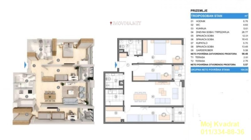 3.5, 104m2 (terasa 6m2), PR/6, CG, lift, telefon, interfon, parking, garaža