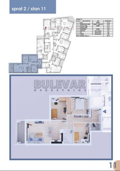 Na prodaju LUX trosoban stan, u izgradnji, na drugom spratu stambenog objekta PO+P+V, na jednoj od najtraženijih lokacija. Sastoji se od dnevne sobe sa kuhinjom i trpezarijom, hodnika, 2 spavaće sobe, sobe za garderobu koja može imati funkciju spavaće sobe, kupatila, wc-a i terase. Stambeni objekat je zamišljen i dizajniran kao eksluzivan i potpuno savremen stambeni prostor za one koji žele nešto više od svog budućeg doma. Počevši od lokacije, kvaliteta gradnje, luksuznog stila i vrhunskog dizajna stanova, pametnih sistema kontrole, eksluzivne stolarije i keramike, savremene izolacije, ovaj objekat se izdvaja od ostalih u ovom delu grada. U neposrednoj blizini reke Nišave, Gimnazije 9.Maj, Gradske kuće i parka, Tvrđave… Početak radova oktobar 2023. godine, završetak radova oktobar 2025. godine. Opremljenost objekta: - Sigurnosna ulazna vrata atestirana na PP zaštitu - Sobna vrata – drvena, presvučena poliuretanom - Zidovi- spoljni zidovi kao i unutršnji pregradni zidovi od termo bloka( termo i zvučna izolacija) - Prozori i vrata: drvo-aluminijum, troslojna stakla, aluminujumske roletne sa elektromotorom - Sanitarija i keramika: - Ugradna WC šolja I vodokotlić - Staklene tuš kabine sa linijskim slivnikom i usponska tuš baterija HERZ - Prvoklasna keramika - Podovi- hrastov parket sa zvučnom izolacijom - Grejanje I hlađenje: Na ovom objektu predviđena je ugradnja najefikasnijih uređaja za grejanje I hlađenje stambenih jedinica. Grejanje i hlađenje samih stambenih jedinica vršiće se preko toplotnih pumpi vazduh-voda, visoke klase energetske efikasnosti A +++, koje pružaju pouzdani rad i komfor u režimu grejanja i do -25 stepeni spoljne temperature. Uređaji su fabrički opremljeni kontrolerom koji je moguće povezati preko mobilne aplikacije i pratiti temperaturu u prostoru, a ujedno i kontrolisati i menjati parameter na toplotnoj pumpi sa Vašeg mobilnog uređaja. Svaka prostorija biće opremljena fan-coil jedinicama poslednje generacije sa inverterskim motorima, sa mogućnošću daljinske kontrole i povezivanje na smart aplikaciju.U svim prostorijama moguće je odraditi podno grejanje u kombinaciji sa fan-coil uređajem,pri čemu se dobija dodatni ugođaj i još veća ušteda električne energije u zimskom periodu. - Odrađena SMART priprema za svaku stambenu jedinicu - Tehnička opremljenost objekta Uređenje zgrade: - Video nadzor sa interfonom - Bešumni Lift - Hodnici zgrade I stepenište obloženo vhunskom keramikom - Rampa za osobe sa invaliditetom - Fasada : termo I zvučna izolacija – kamena vuna. Kupci prve nekretnine imaju pravo na povraćaj PDV-a. Uz stan se prodaje garažno mesto, koje nije uključeno u cenu stana, već se posebno doplaćuje. Za više informacija slobodno nas kontaktirajte.