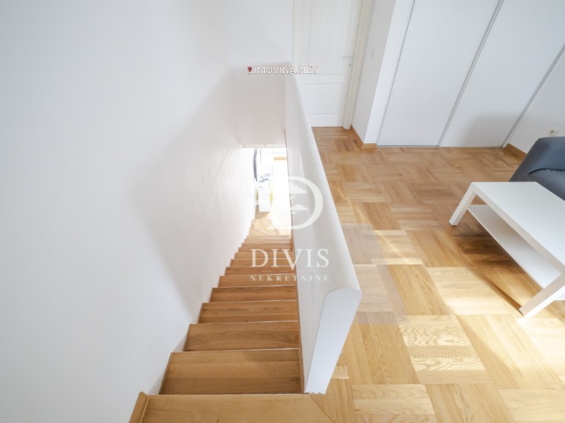 Pozicioniran je na četvrtom i petom spratu i organizovan u dve etaže. Na donjoj etaži se nalaze ulazni hodnik, kupatilo, prostrana kuhinja i dnevni boravak sa trpezarijom i izlazom na terasu. Na gornjoj etaži su dve spavaće sobe i još jedno kupatilo. Jedna soba ima blagu kosinu i krovni prozor, dok visina plafona u stanu varira od standardnih 2,7 metara do 3,2 metra u najvišem delu, što prostoru daje dodatnu visinu i svetlost. Stan je u odličnom stanju, ne zahteva nikakva dodatna ulaganja.