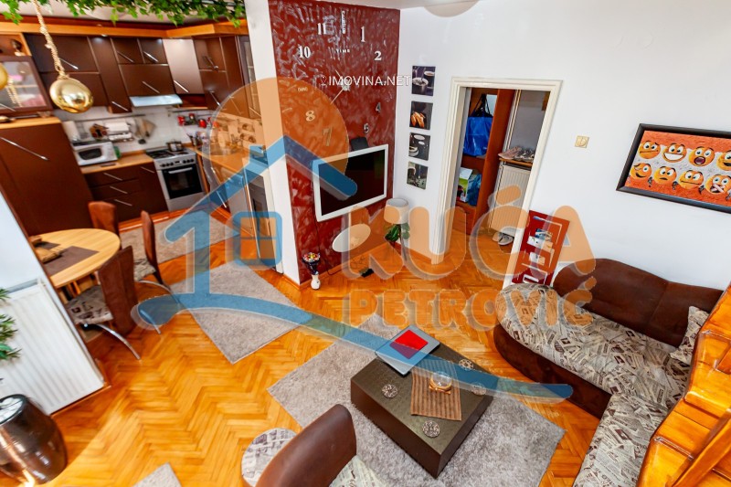 Stan je po strukturi četvorosoban, uknjižene površine 71 m2. Sastoji se od hodnika, dnevne sobe, velike trpezarije sa kuhinjom i kupatila u donjem delu stana. Iz dnevne sobe stepenice vode do gornjeg dela stana koji se sastoji od hodnika, tri spavaće sobe i kupatila.